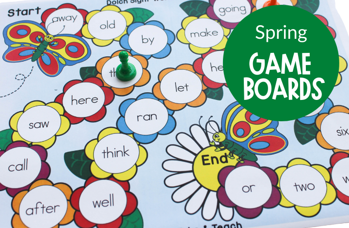 Yeah! Spring is almost here! Living in the north, when the calendar says it’s spring it often doesn’t feel like spring at all. It is not uncommon to still have several inches of snow on the ground well into April. But when we flip that calendar to May- well, that’s when it feels like spring and that’s when I go grab those game boards for spring literacy centers. One of my favorite spring themed activities for teaching sight words are the spring-themed sight word and phonics game boards. There are 4 different designs and 9 game boards containing words from the Dolch 220 sight word list. Each game board contains 25 words from each of the 9 lists. The game